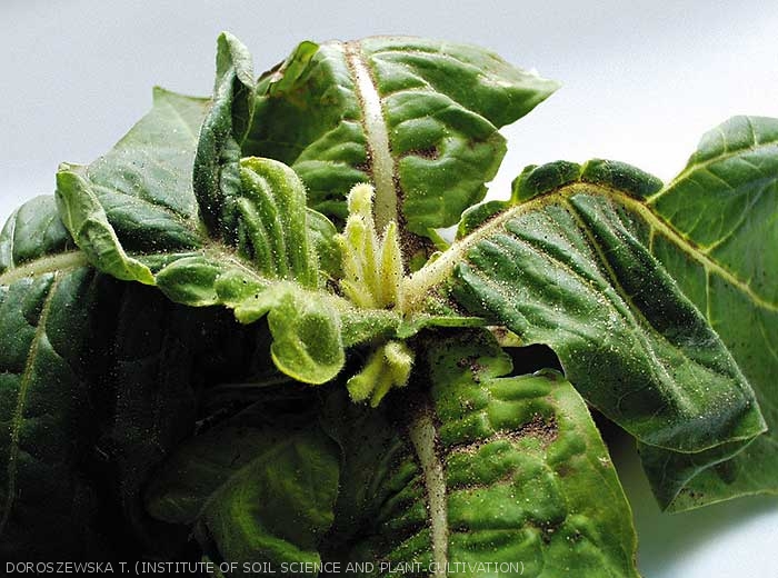 ♦ une déformation et la nécrose de l'extrémité ou de la base des jeunes feuilles, avec dépérissement du bourgeon terminal ;
