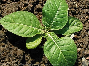 ♦ une marbrure ou chlorose diffuse plutôt localisée aux feuilles basses, accompagnée ou non de taches nécrotiques et/ou de légers dessèchements ;
