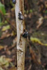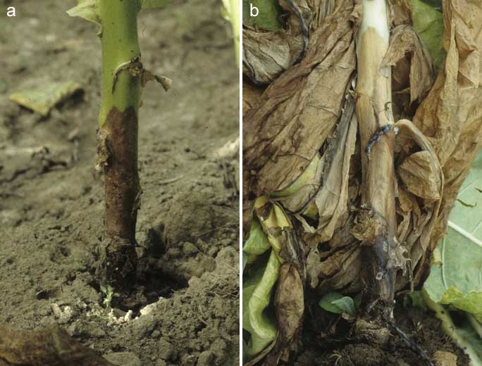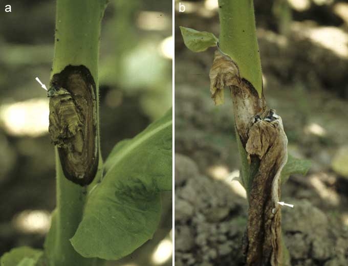 Sur plantule, ce sont surtout ses chancres sur tige qui sont particulièrement dommageables (figure 1). Ce champignon gagne cette dernière après avoir colonisé les cotylédons ou l'une des premières feuilles sénescentes. Les chancres, localisés sur la partie basse de la tige, sont humides et brun clair et ont tendance à se couvrir d'un dense mycélium blanc et de gros sclérotes noirs très caractéristiques. Quelques lésions peuvent évoluer après plantation, si elles n'ont pas été détectées au moment du prélèvement et du triage des plants.