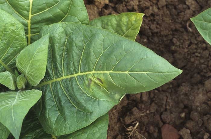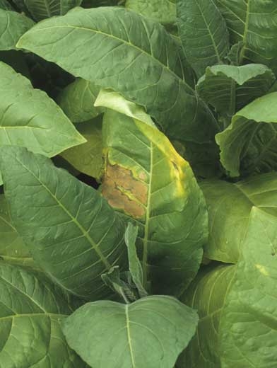 De larges plages de tissus brunissant et se desséchant progressivement (figures 1 et 2) sont observées sur certaines feuilles de tabac en pleine croissance, particulièrement exposées au rayonnement solaire lors des périodes de fortes chaleurs. Ces feuilles, très succulentes, soumises à des humidités relatives très faibles et des températures élevées, flétrissent partiellement et se dessèchent notamment en bordure et à leur extrémité. Le nombre de plantes et de feuilles affectées est communément faible.