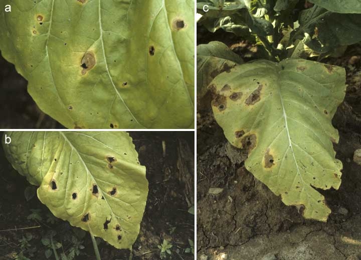 Thanatephorus cucumeris (Rhizoctonia solani) est surtout connu sur tabac pour provoquer des fontes de semis ("damping-off) (figure 1), des altérations au collet ("sore shin") (figure 2) et, dans certains pays, des taches foliaires ("target spot") (figure 3). Son pouvoir pathogène sur les racines des tabacs cultivés en plein champ n'est pas bien connu et nous semble un peu sous-estimé.