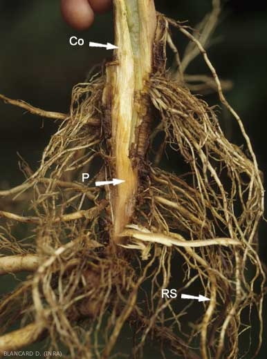 Ces symptômes évoluent après plantation ou surviennent en plein champ, durant des périodes de conditions climatiques favorables et en présence de souches particulièrement agressives. Elles se traduisent par le brunissement et la disparition de nombreuses racines nourricières et par la pourriture du cortex des racines, du pivot et de la partie de tige enterrée. Dans les tissus altérés, on observe grâce à un microscope la présence d'oospores (figure 4).