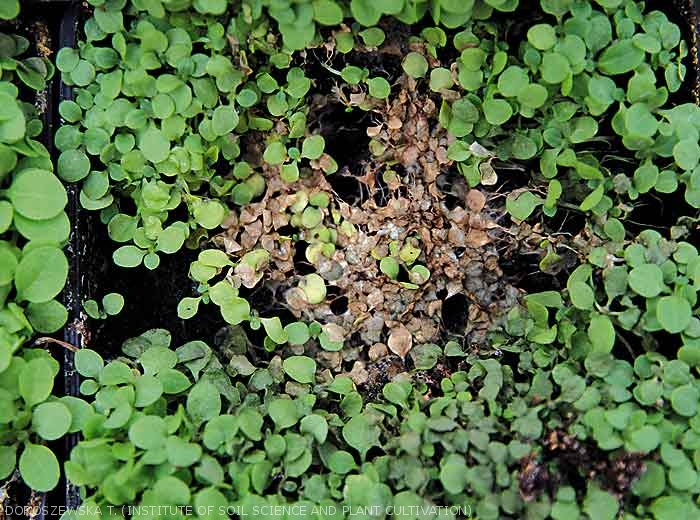 Les oomycètes et plus particulièrement les Pythium spp. sont à l'origine d'altérations brunes, humides et molles, s'initiant sur la tige des plants, au niveau de la surface du sol. Les racines sont parfois affectées ; elles prennent une teinte brun clair et leur cortex se désagrège plus ou moins (figures 1 à 2). Les plantules altérées donnent l'impression de fondre en foyer (à l'origine de l'appellation fonte de semis) (figure 3)