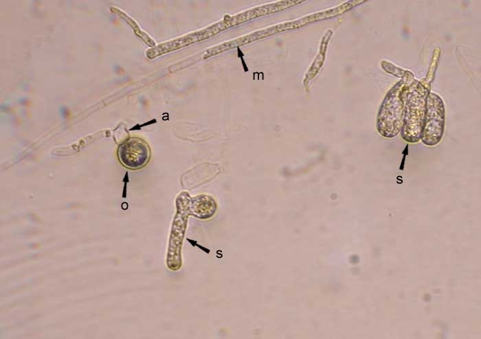Ces champignons pénètrent directement dans les tissus épidermiques ou passent par l'intermédiaire de blessures. Ils envahissent rapidement les tissus, grâce à l'action conjuguée de diverses enzymes pectinolytiques et cellulolytiques et progressent entre et dans les cellules. Des sporanges et des oospores se forment à l'intérieur des tissus ou à leur surface.