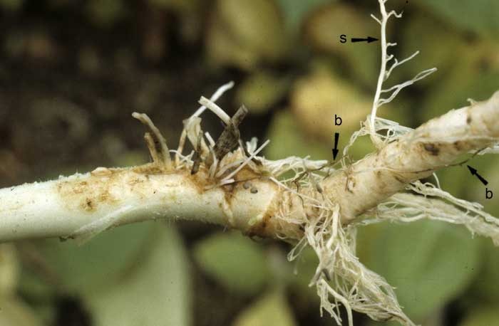 Les plantes affectées sont souvent peu développées et chlorotiques. Elles flétrissent parfois durant les journées chaudes.