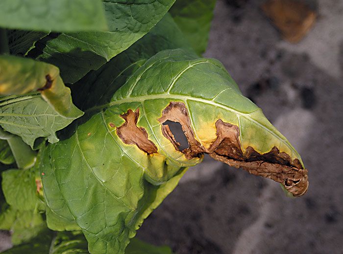 Thielaviopsis basicola est un champignon du sol qui se développe aussi bien en pépinière (figures 1 et 2) qu'au champ. Il est responsable d'importants dégâts sur la partie souterraine des plantes. Il colonise progressivement les racines, provoquant de nombreuses altérations brunes à noires sur toute leur longueur et détruisant une grande partie des radicelles nourricières (figure 3). A terme une proportion importante du système racinaire présente une pourriture noire assez caractéristique (figure 4). Les grosses racines, un peu moins sensibles, portent des manchons superficiellement subérisés de couleur brune à noire (figures 5 et 6).