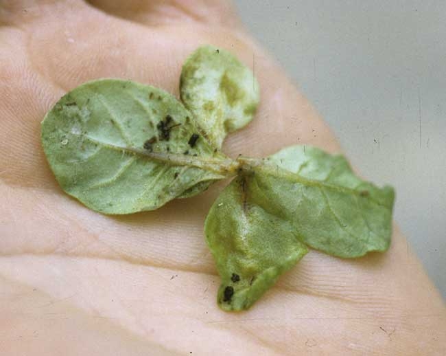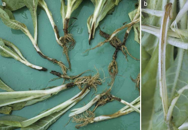 Dans les pépinières, où la densité des plants est importante et dans lesquelles les plantules possèdent des tissus particulièrement succulents, il n'est pas rare de constater le développement d'une pourriture noire au niveau des tiges. En général, celle-ci est due aux effets d'une bactérie, Pectobacterium sp. qui, après avoir colonisé des feuilles au contact du sol ou sénescentes, gagne la tige et provoque une pourriture humide et noire assez caractéristique, dénommée jambe noire des plantules de tabac ("Black leg") (figures 4 et 5).