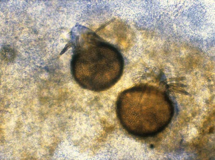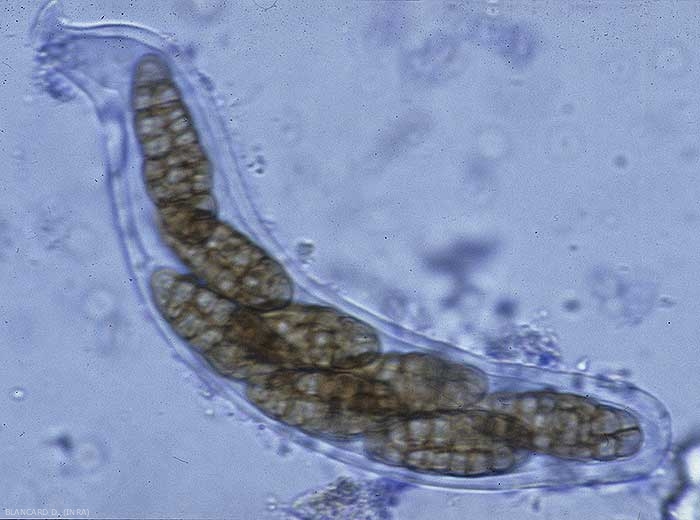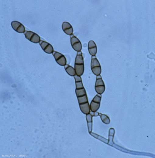 Toutefois, chez les plantes cultivées parasitées par ce type de champignon, c'est le plus souvent l'anamorphe (reproduction asexuée) qui a été décrite. Très souvent chez ces champignons, la production des conidies se fait en chaîne sur des conidiophores (par ex. Pleosporaceae ou Mycosphaerellaceae, figure 2). Chez d'autres pathogènes les conidies sont produites dans des acervules ou des pycnides (figures 3 et 4).