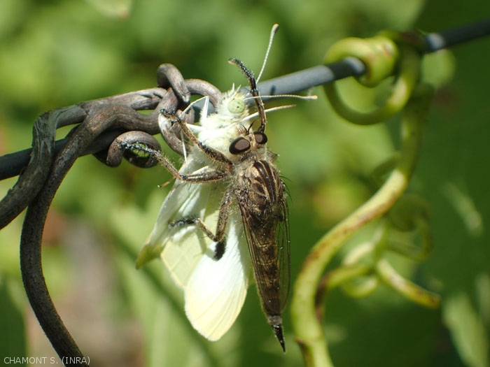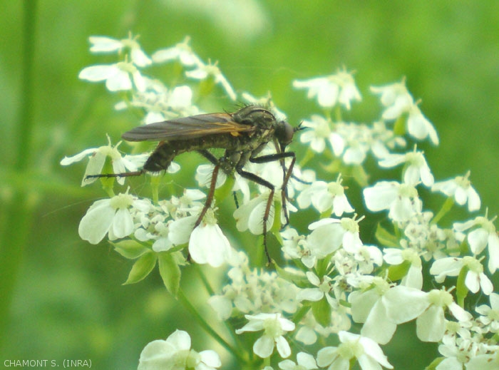 Les Chamaemyiidae (figure) forment une petite famille dont les adultes et les larves consomment des pucerons et des cochenilles. Moins connues, d'autres familles renferment des espèces prédatrices intéressantes. Par exemple, chez les Asilidae (mouches à toison, figure), les adultes sont munis d'une trompe rigide leur permettant de transpercer leurs proies et d'y injecter la salive puis d'aspirer le contenu prédigéré. Ce sont des prédateurs de lépidoptères (---> plus d'infos). D'autres familles de diptères comme celles des Mydidae, Therevidae, Dolichopodidae, Empididae (dance flies, figure) et Sciomyzidae comprennent des espèces entomophages.