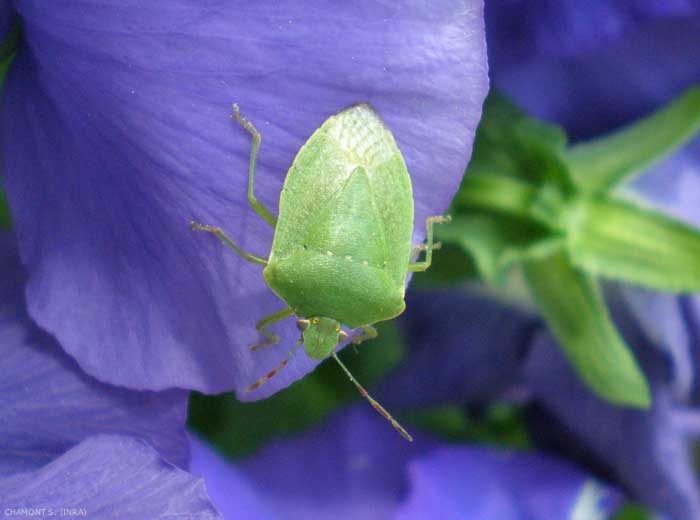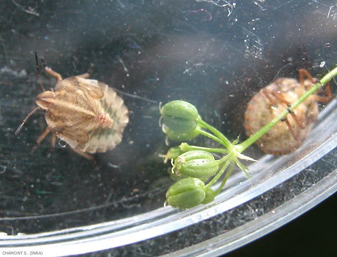 Certaines espèces de cette famille de ravageurs peuvent être parasitées par le diptère Tachinidae Trichopoda pennipes (Fabricius, 1781) sur lesquelles pond la femelle, et dont la larve pénètrera dans l'insecte pour s'y développer en consommant les tissus de l'hôte. Ce parasitoïde a été introduit en France pour lutter contre Nezara viridula. Parmi les hyménoptères parasitoïdes, on trouve assez communément Trissolcus et Telenomus (Scelionidae), Anastatus (Eupelmidae) et Ooencyrtus (Encyrtidae) qui se développent dans les oeufs (parasitoïdes oophages, photo).