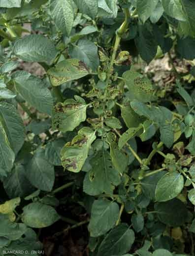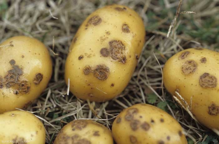 La gangrène (Boeremia foveata, anc. Phoma exigua var. foveata et P. exigua var. exigua), la pourriture sèche causée par des fusarioses (Fusarium coeruleum et F. sulphureum, figure 2) et les pourritures bactériennes occasionnent en cours de conservation des pertes plus ou moins graves. La gale commune (Streptomyces scabies, figure 3), tout comme la gale argentée (Helminthosporium solani, figure 4) et le rhizoctone (figure 5) déprécient la qualité marchande des tubercules.