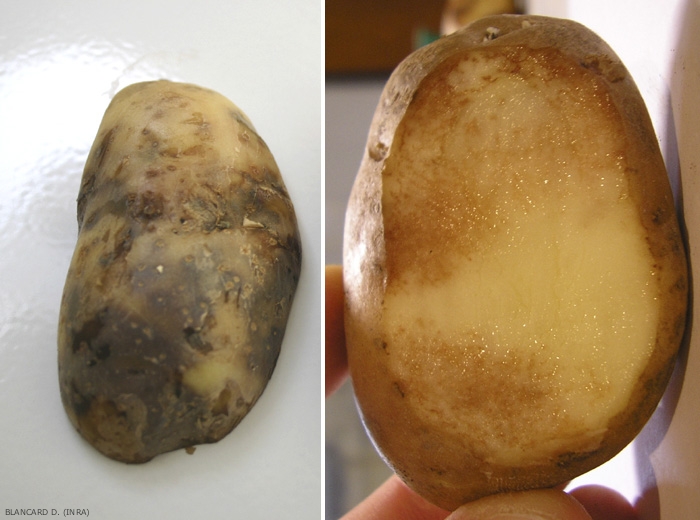 Les tubercules de pomme de terre mildiousés présentent des taches violacées à brunes au niveau de l'épiderme tandis que la chair est infiltrée de zones marbrées de couleur rouille à texture fibreuse ou granuleuse qui donne un aspect de pourriture sèche (figure 4). Sur tomate, les fruits atteints sont souvent bosselés. Ces derniers restent relativement fermes quelle que soit la précocité de l'attaque (figure 5). Si les attaques surviennent plus tardivement, on observe des plages marbrées plus homogènes et souvent réparties en cercles concentriques festonnés qui peuvent prêter à confusion avec celles occasionnées par Phytophthora nicotianae.