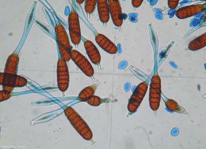 Ces écidiopsores vont se disperser sur la surface de la feuille puis germer et pénétrer les tissus. La sporulation aboutit à la formation des urédosores orangés qui produisent des urédospores (figure 1) mesurant 20-28 X 15-22 µm et accompagnées de paraphyses. La membrane de ces urédospores, d'une épaisseur de 2-2,5 µm, est finement verruqueuse et percée de 6 à 10 pores germinatifs (figure 2).