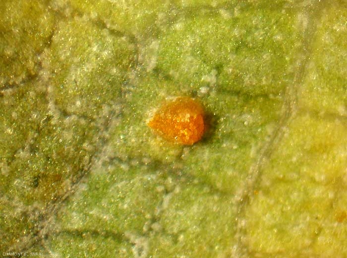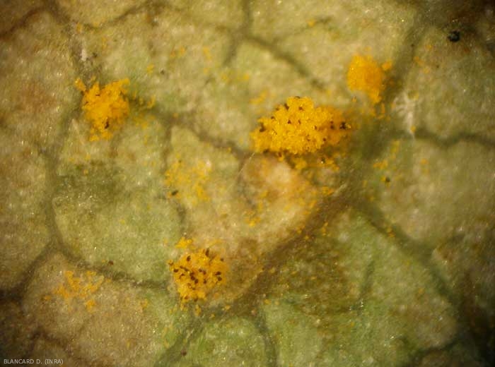 Les symptômes apparaissent sous différentes formes aussi bien sur les feuilles que les pousses, tiges et pédoncules floraux. Le symptôme le plus évident est constitué de petites taches anguleuses jaunes sur la face supérieure des feuilles (figure 1). A l'opposé de ces taches, on peut observer sur la face inférieure la présence de pustules orangées (urédosores, figures 2 et 3) puis de pustules brunes à noires (téleutosores, figure 4), ces deux stades étant fréquemment présents ensembles sur les feuilles (figure 5). Les deux types de spores peuvent être aussi présentes dans le même sore (figure 6).