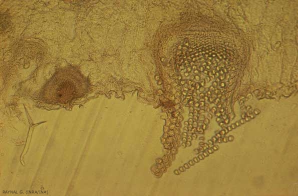 Les écidiospores, produites par les écidies (figure 4) sont polyédriques ou arrondies et leur diamètre varie de 12 à 16 µm. Leur membrane est mince, finement ciliée et transparente.