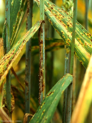 En fin de saison, lorsque la plante est proche de la maturité, les pustules virent au noir (figures 3 et 4) avec la production de téleutospores. Il est possible d'observer sur une même plante la présence des 2 stades (urédospores et téleutospores). Dans ce cas, l'épiderme prend une teinte rouille noire.