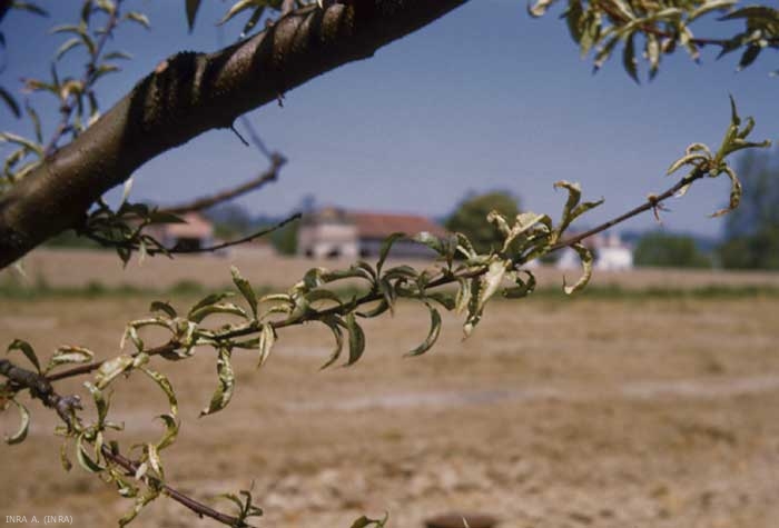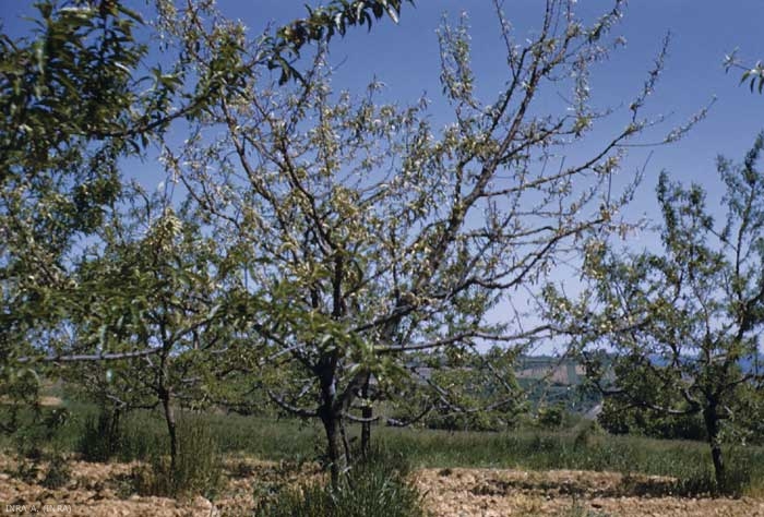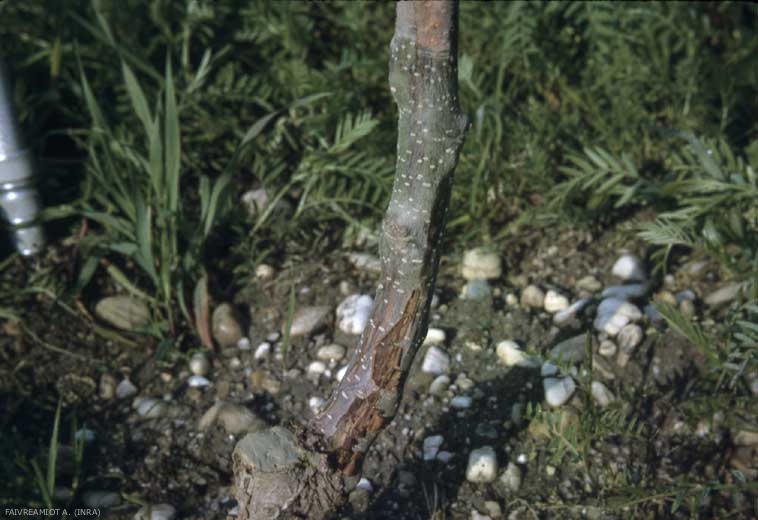 Sur les parties lignifiées, des nécroses de l'écorce (figure 3) vont se former et les extrémités des rameaux se dessécher. Un épanchement de gomme sera par la suite observé. Lors d'attaques importantes, les branches finissent par dépérir avec l'apparition d'une pourriture sèche. Les rameaux finissent par avoir un aspect court-noués (figures 4 et 5) et meurent au bout de quelques années.