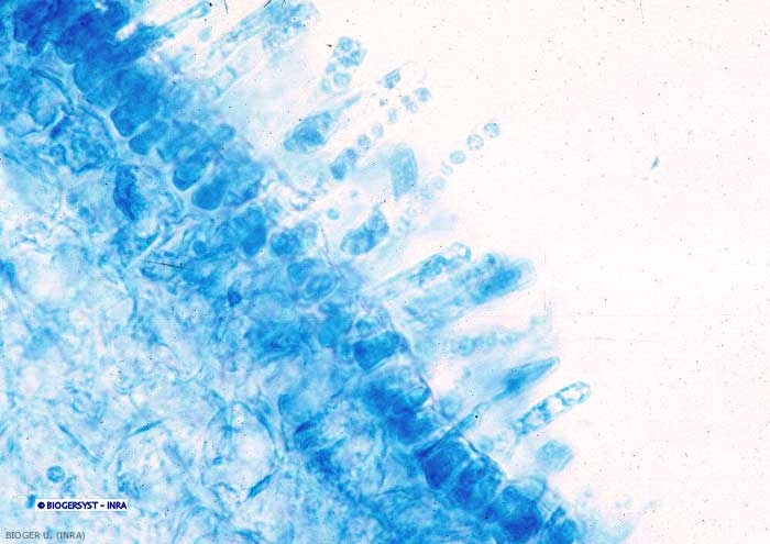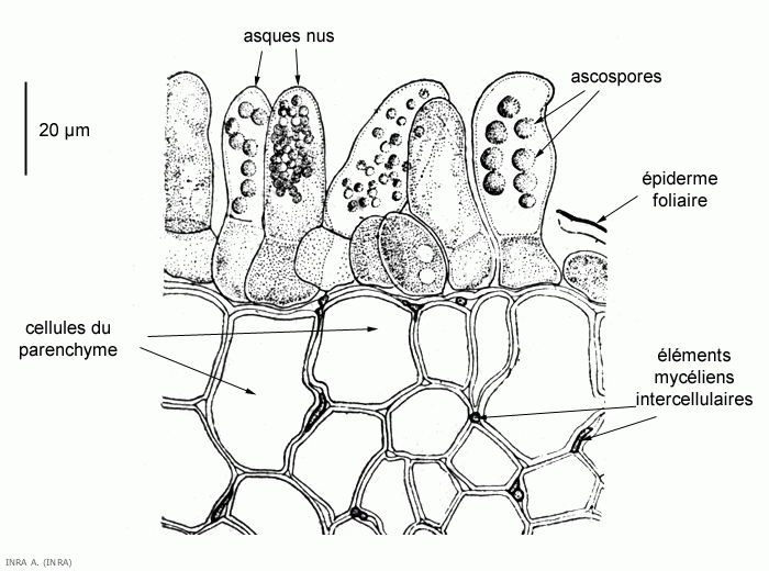 A la face externe des parties cloquées, c'est à dire du côté de l'épiderme supérieur, se forme un hyménium subcuticulaire dont un certain nombre d'éléments s'allongent puis percent la cuticule en formant des structures cylindriques bicellulaires. La partie inférieure constitue la cellule basilaire tandis que la loge supérieure est l'asque proprement dit (figures 2 et 3). Ce champignon est donc dépourvu de sporophores et les asques sont disposés au hasard. Les asques sont de forme ovoïde ou cylindrique et présentent un renflement au sommet (25-40 x 8-11 µm). Leur contenu se divise en même temps que les noyaux pour donner 4 ou 8 ascospores qui germent souvent à l'intérieur de l'asque. Ces ascospores sont de forme sphérique, de couleur hyaline, et mesurent 3 à 4 µm de diamètre. Une déchirure ou une réabsorption de la paroi entraîne la libération des ascospores.