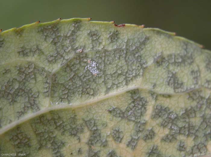 Se développant dans les tissus de la plante hôte, le mycélium du mildiou du rosier est intercellulaire. Le parasite produit des suçoirs (haustoria) filamenteux et digités (figure 1), en nombre réduit, qui pénètrent dans les cellules au dépend desquelles il se nourrit.