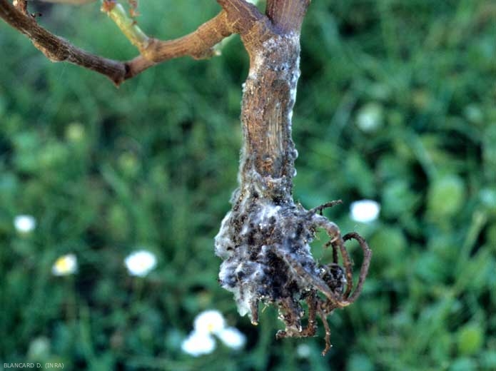 R. necatrix provoque une pourriture des racines et du collet. Celle-ci est surmontée d'un tapis de mycélium laineux blanc d'une épaisseur de 2 à 3 cm qui s'affaisse par temps froid ou sec (figure 2). Lorsque l'écorce de la racine et de la base du tronc est décollée, du mycélium interne est observé. Il s'étend en lames minces, composées de filaments incolores, gris ou noirs, et dégage une forte odeur de champignon pourri. Un suintement gommeux, noir, est observé à l'extrémité de la racine dont l'écorce devient fragile et crevassée.