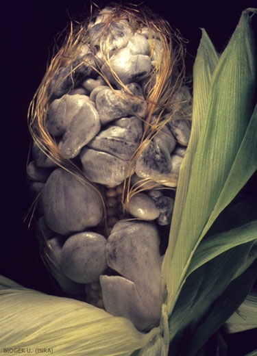 La rupture de la membrane peut être déclenchée par plusieurs phénomènes ; dans un premier cas c'est le vent qui en provoquant un balancement des tiges de maïs va permettre le heurt des vésicules sporifères et donc leur éclatement, dans un autre cas c'est la grêle qui va déchirer le sac et libérer les spores. De plus, si le temps est sec et ensoleillé, les tumeurs se désagrégent plus facilement. Les spores sont facilement transportées par le vent et la pluie ce qui provoquera une propagation plus rapide du champignon. Les tumeurs peuvent être aussi éventrées lors de la récolte et les téleutospores répandues dans les champs par les machines agricoles (figure 3).