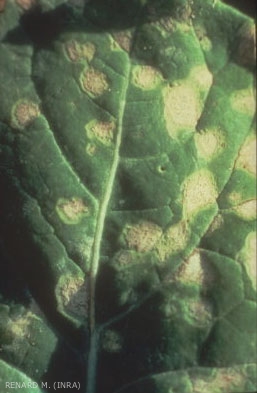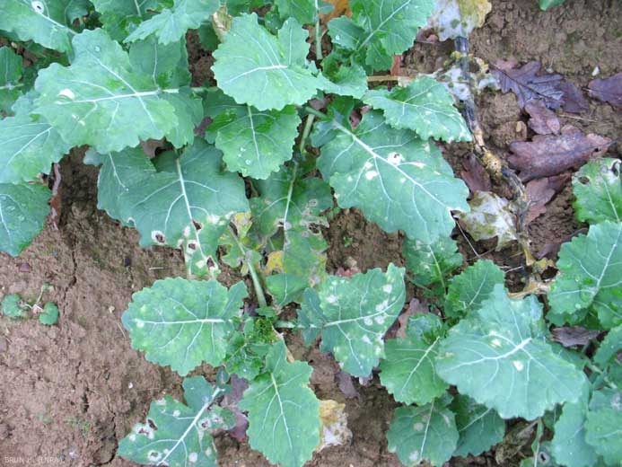 Ce champignon provoque des macules de couleur blanc à gris cendré de 5 à 15 mm de diamètre sur les cotylédons et sur les feuilles (figures 1 à 3) sur lesquelles se différencient les pycnides, points noirs caractéristiques. Après une phase hivernale sans symptôme, les nécroses du collet apparaissent à la reprise de végétation (figure 4).