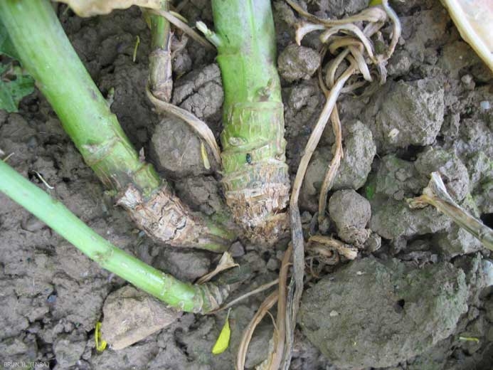 Les plantes malades versent et/ou se dessèchent prématurément. La mort de la plante par sectionnement du collet peut se produire de la fin de l'hiver jusqu'à la récolte. Les nécroses du collet sont les symptômes les plus préjudiciables au rendement.