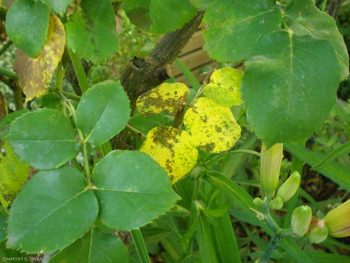 Pour certaines variétés, les symptômes peuvent également apparaître sur le réceptacle floral et affecter ainsi les bractées du calice et des pétales.