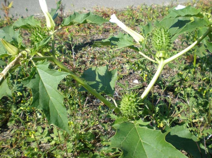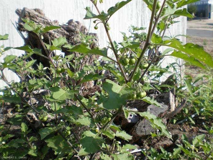 Cet acarien se développe sur toutes les parties aériennes de la tomate (figure 1) et de la pomme de terre, des morelles (Solanum nigrum, S. villosum, S. nodiflorum), des datura et des pétunia (figures 2 et 3).
