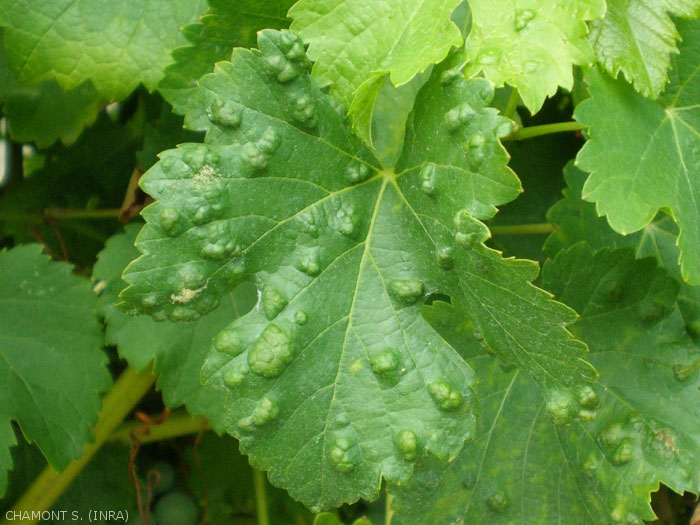 D'autres organes végétaux (bourgeons axillaires, stipules, bractées, ébauches florales, jeunes fruits) peuvent se trouver infestés avant d'être dégagés du bourgeon terminal ; les pétioles, les pédoncules et les vrilles sont quelquefois recouverts d'un véritable manchon de ces galles et la croissance de la plante est entravée.