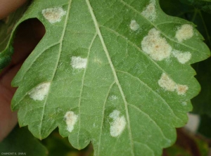 Les piqûres sur les jeunes feuilles déterminent l'apparition de boursouflures typiques plus ou moins étendues (figures 1 et 2), recouvertes à leur face inférieure d'un feutrage très dense, blanc ou rose puis brun (figures 3 et 4). Ce feutrage se forme par hypertrophie de la pilosité de la feuille.