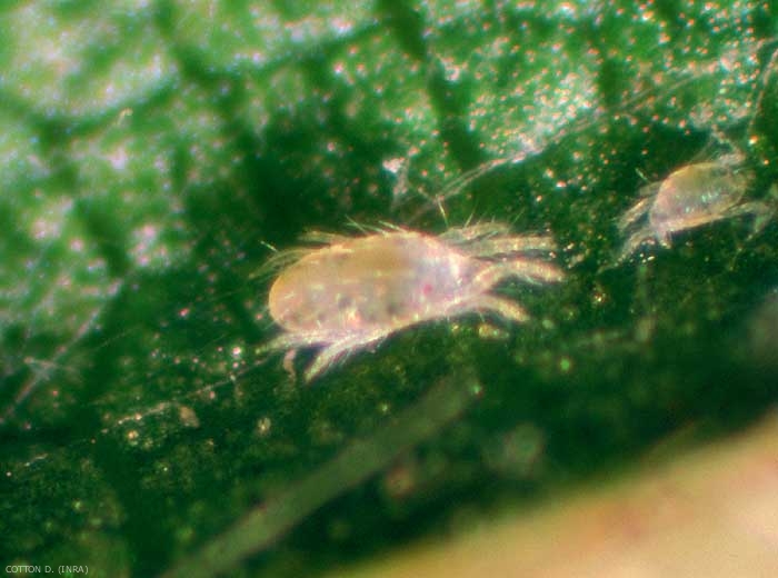 Adulte, la femelle a un corps oblong de 0,35 mm de long sur 0,20 mm de large ; le mâle est plus petit, fusiforme et très mobile. Pendant la période d'activité, la femelle est jaune clair avec quelques taches brunes sur les côtés de l'opisthosome (figure 1). La femelle hivernante est uniformément jaune citron (figure 2). Le dos porte 7 rangées de soies longues et fines.