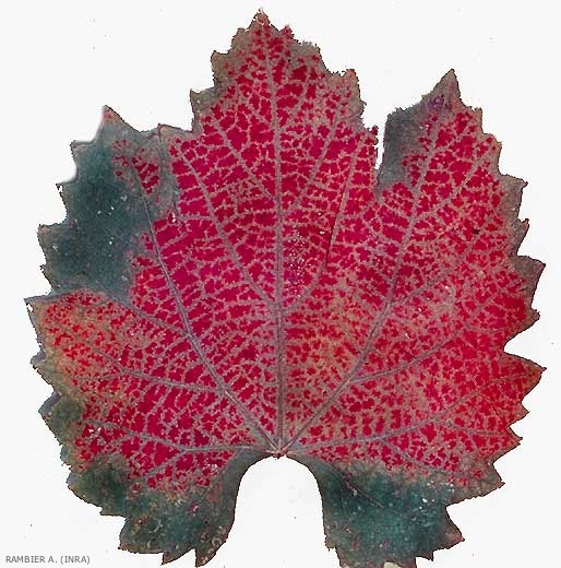 En été, les attaques provoquent l'apparition de taches le long des nervures (rouges pour les cépages rouges, figure 3) et brunes pour les cépages blancs (figure 4) qui finissent par envahir tout le limbe, en épargnant les nervures. L'arrêt presque total de la photosynthèse entraîne une diminution de la récolte, des retards de maturité et des insuffisances dans la richesse en sucre de la vendange représentant une perte de 1 à 3° d'alcool.