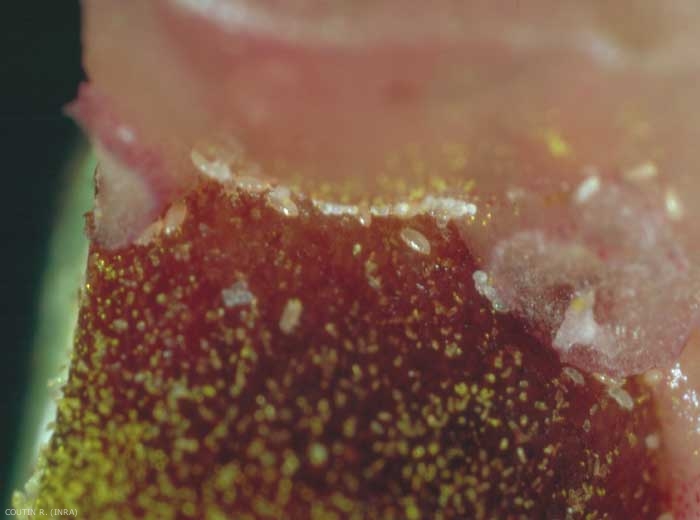 En France, il attaque le fraisier en culture de plein air. L'espèce hiverne généralement sous forme de femelles fécondées réfugiées dans des feuilles repliées, dans des anfractuosités des bourgeons ou des pétioles (figure 1).