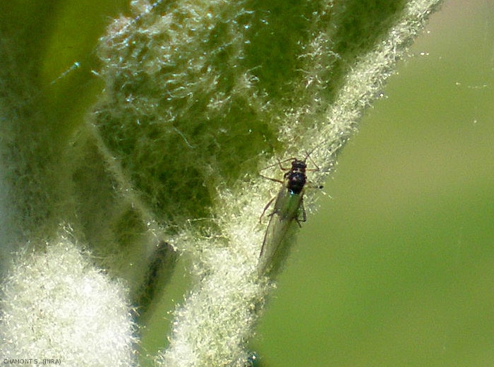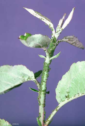 Pour se nourrir, les pucerons insèrent leur stylet dans le phloème des jeunes rameaux. Ils sont souvent groupés sur les pousses en gaines compactes pouvant atteindre plusieurs centaines d'individus (figure 2). Ils envahissent la face inférieure des feuilles terminales qui s'enroulent et se recroquevillent légèrement.