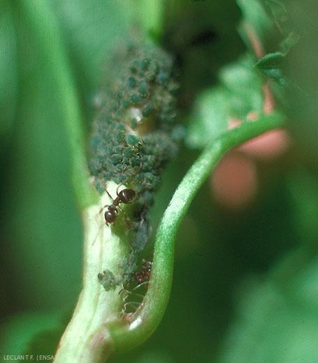 Les colonies de A. grossulariae sont abondamment visitées par les fourmis (figure 1) qui utilisent le miellat produit par les pucerons.