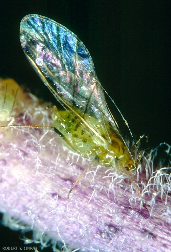 L'adulte ailé est de taille semblable ; la tête et le thorax sont brun foncé à noirs, l'abdomen vert-jaunâtre marqué de points et de barres transversales brun foncé (figure 2).