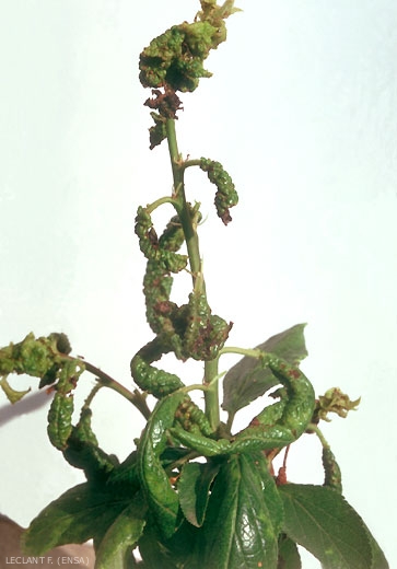 Sous l'action des piqûres des fondatrices et de leur descendance, les feuilles du prunier se crispent très fortement, s'enroulent et s'appliquent le long de la tige (figures 1 et 2). Sur le tournesol, les pucerons se localisent sur les feuilles qui se crispent. Ils gagnent ensuite les capitules et forment des colonies denses entre les graines. Sur l'artichaut, les bractées rougissent et durcissent. Par ailleurs, ce puceron est l'un des vecteurs du virus de la sharka (PPV, Plum pox virus), virus très redouté dans les vergers.