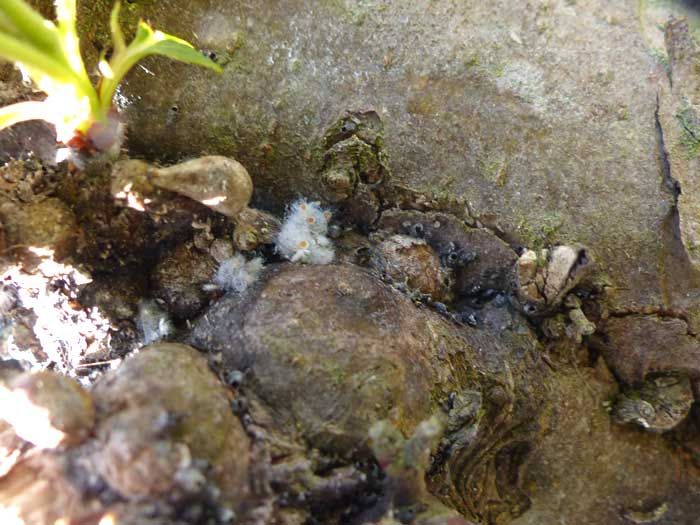 Les larves et les femelles aptères hivernent, réfugiées sous des écorces, dans des anfractuosités du tronc (figure 2), des chancres, ou sur les racines au voisinage du collet. La reprise d'activité intervient au début du printemps, en mars-avril, et les femelles commencent à se reproduire, chacune d'elles engendrant plus de 100 larves. Les pullulations intenses forment d'importantes colonies blanchâtres. Les ailés apparaissent à partir de juillet et assurent la dispersion et la formation de nouvelles colonies sur d'autres arbres.