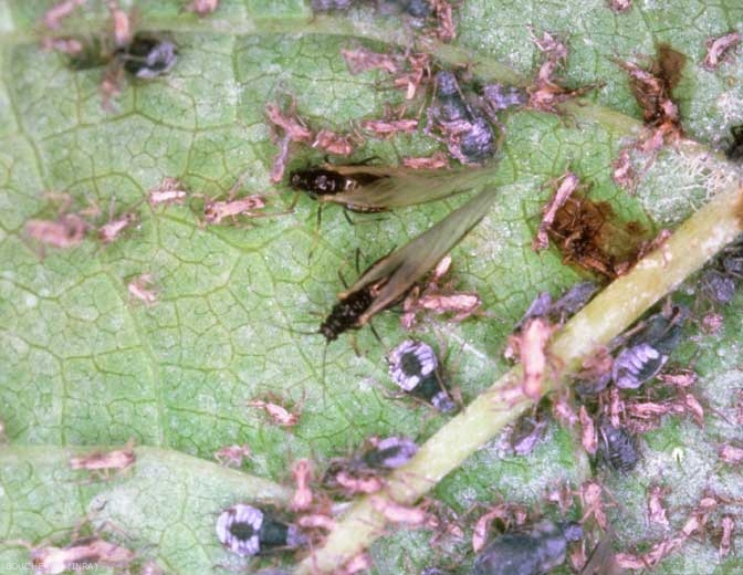 Une forte proportion de pucerons sont aptères et restent sur les plantes-hôtes primaires (figure 1). Par ailleurs, dans le courant de l'été, des ailés apparaissent, qui ne vont pas sur les roseaux mais se dispersent sur d'autres pruniers ou prunelliers.