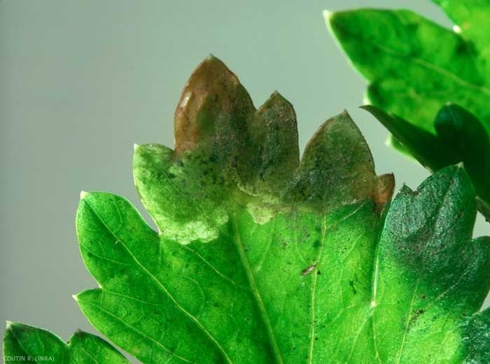 Ce sont les larves qui causent des dégâts. Les feuilles sont parcourues de mines, les mines collectives se traduisant par une grosse cloque blanche devenant brune (figure 2). Les excréments brillent par transparence, entre les 2 épidermes de la feuille. Les feuilles prennent une allure brûlée et desséchée. Privé ainsi d'une grande partie de la surface foliaire et ayant donc une activité photosynthétique réduite, le céleri ne produit qu'un bulbe chétif.