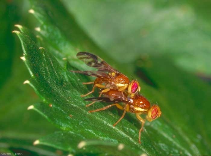 L'adulte est une mouche de 5 à 6 mm de longueur. Les individus de la génération d'été sont relativement clairs, rouge jaune, avec la tête claire (figure 1). Ceux de la génération d'hiver sont noir brillant. Les deux formes ont une tête jaune. Tous ont des ailes sombres et rayées, caractéristique de la famille des Tephritidae.
