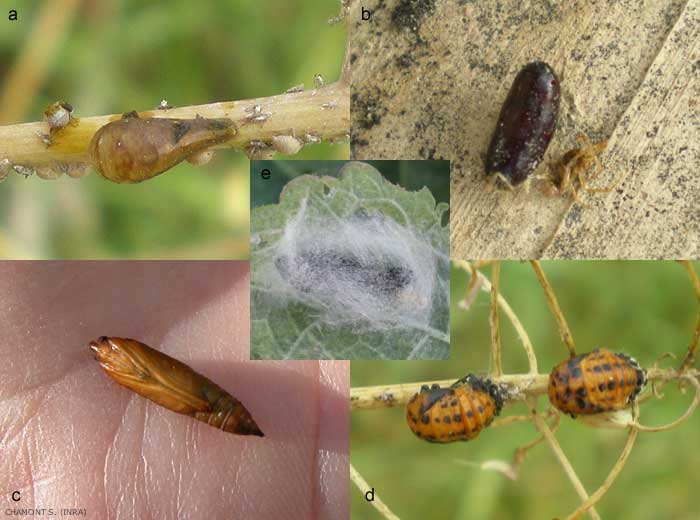 - nymphe : état intermédiaire entre la larve et l'adulte chez les insectes holométaboles. Chez les lépidoptères la nymphe s'appelle chrysalide et chez les diptères supérieurs, pupe. Les nymphes sont souvent abritées dans un cocon, dans une loge ou dans une coque fabriquée par la larve à l'aide de sécrétions anales ou excrémentielles fluides (cas des coléoptères, hyménoptères).