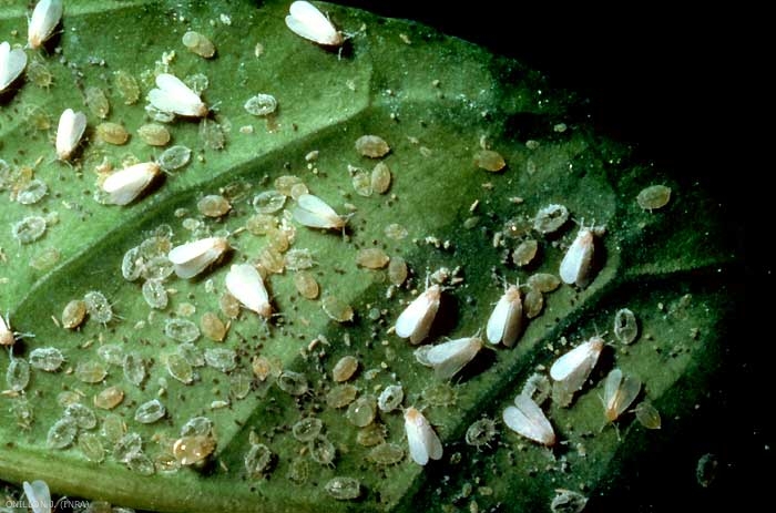 Les adultes se regroupent au sommet des plantes, sur les organes les plus jeunes ; ils s'envolent rapidement si on les dérange. Cet aleurode est responsable de dégâts très graves : prélèvement de sève, émission de miellat et formation de fumagine (figures 3 et 4). Sur une feuille de haricot, on peut compter jusqu'à 2 000 larves, chacune capable de produire 20 gouttes de miellat en une heure. Les tomates attaquées sont impropres à la commercialisation (figure 5). Par ailleurs, cet insecte peut aussi transmettre des viroses.