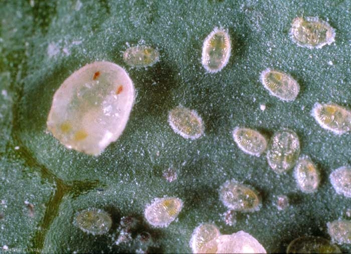 La femelle peut pondre plus de 500 oeufs au cours de sa vie qui dure 3 à 6 semaines. Les oeufs sont pondus disposés en cercle sur les feuilles lisses (figure 1) ; mais, sur les feuilles poilues, ils sont plutôt éparpillés et moins régulièrement disposés. Peu après la ponte, les oeufs prennent une couleur foncée ; leur éclosion a lieu 9 jours plus tard environ à 21°C. Les larves nouveau-nées passent par une courte période de mobilité avant de s'installer pour s'alimenter, leurs stylets enfoncés dans le tissu foliaire, ceci pendant la durée des 3 stades. Puis, elles cessent de s'alimenter, muent, et demeurent dans le puparium durant 18 jours environ (figure 2).