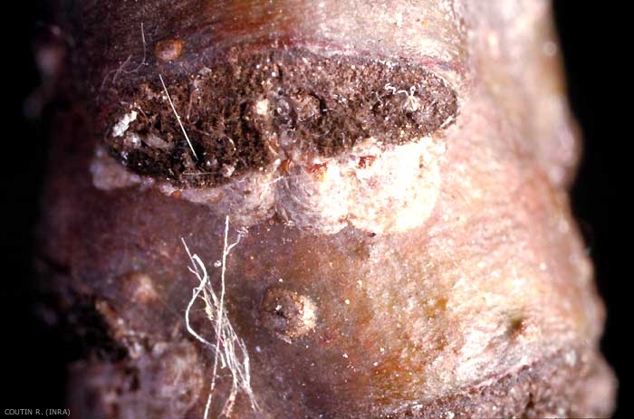 Les jeunes larves sont mobiles pendant quelques heures puis elles se fixent, principalement sur les rameaux en introduisant leurs stylets dans le végétal et sécrètent leur bouclier ; elles poursuivent leur développement et donnent des femelles en automne. Les mâles apparaissent au mois d'août.