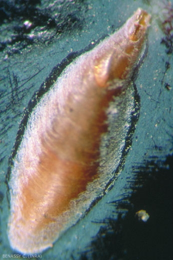 L'oeuf est de forme ovale et blanc. La larve est brun jaunâtre, mobile, de forme ovalaire.