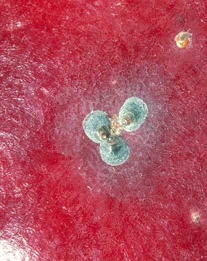 La femelle adulte possède un bouclier de couleur gris foncé, aplati, de forme circulaire presque régulière, et d'un diamètre de 1,8 à 2,2 mm (figure 1). Le corps, de forme lenticulaire, est jaune citron à rouge orangé. La tête et le thorax sont fusionnés ; les 4 derniers segments abdominaux sont soudés en un pygidium.