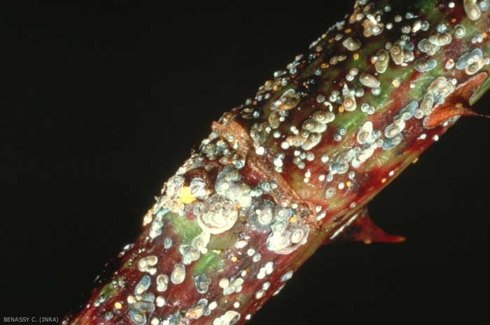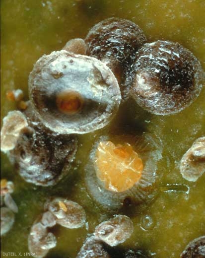 La jeune larve est mobile, jaune, munie de 3 paires de courtes pattes (figure 2). Une fois fixée, elle sécrète un bouclier blanc, qui devient gris, puis noir.