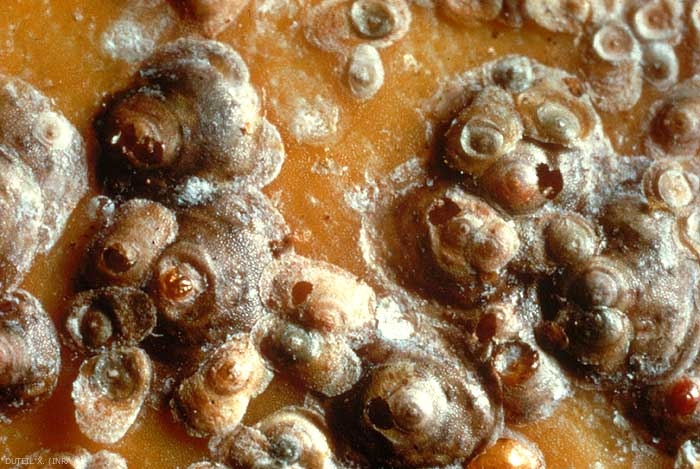 Les piqûres d'alimentation, s'accompagnant de l'injection d'une salive toxique, provoquent des déformations des organes végétaux, la chute des feuilles, des colorations de l'épiderme des fruits (figure 3) ainsi que le dépérissement des rameaux et des branches colonisés.
